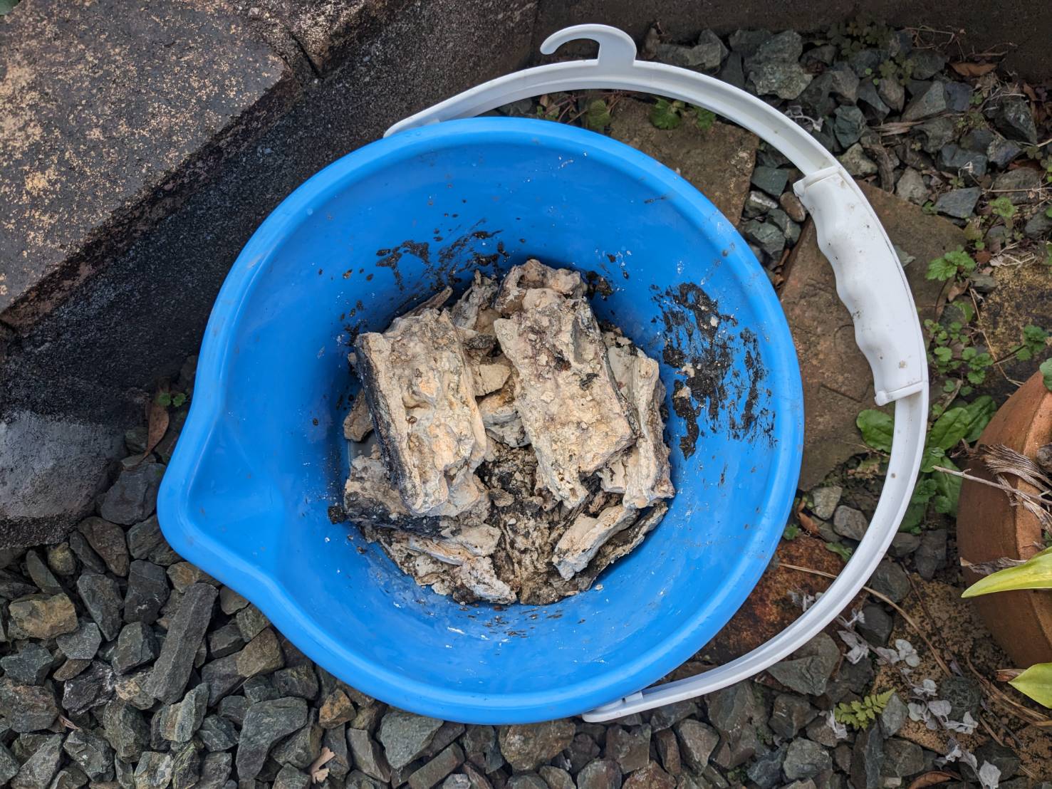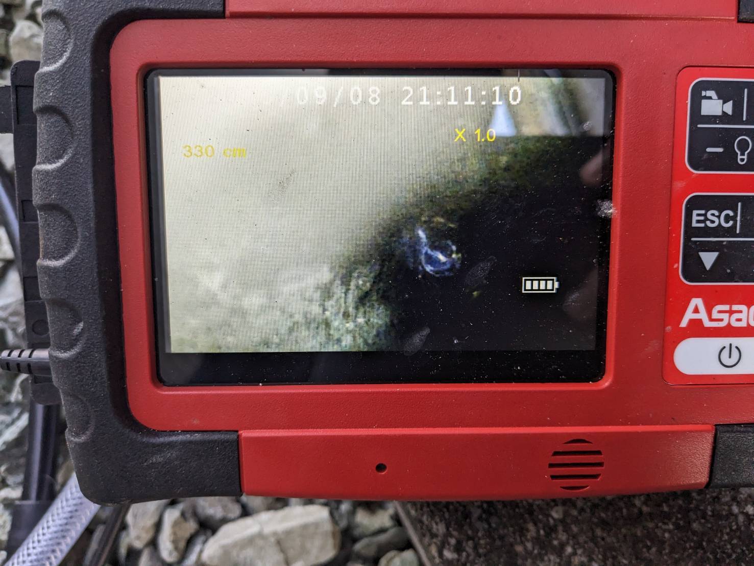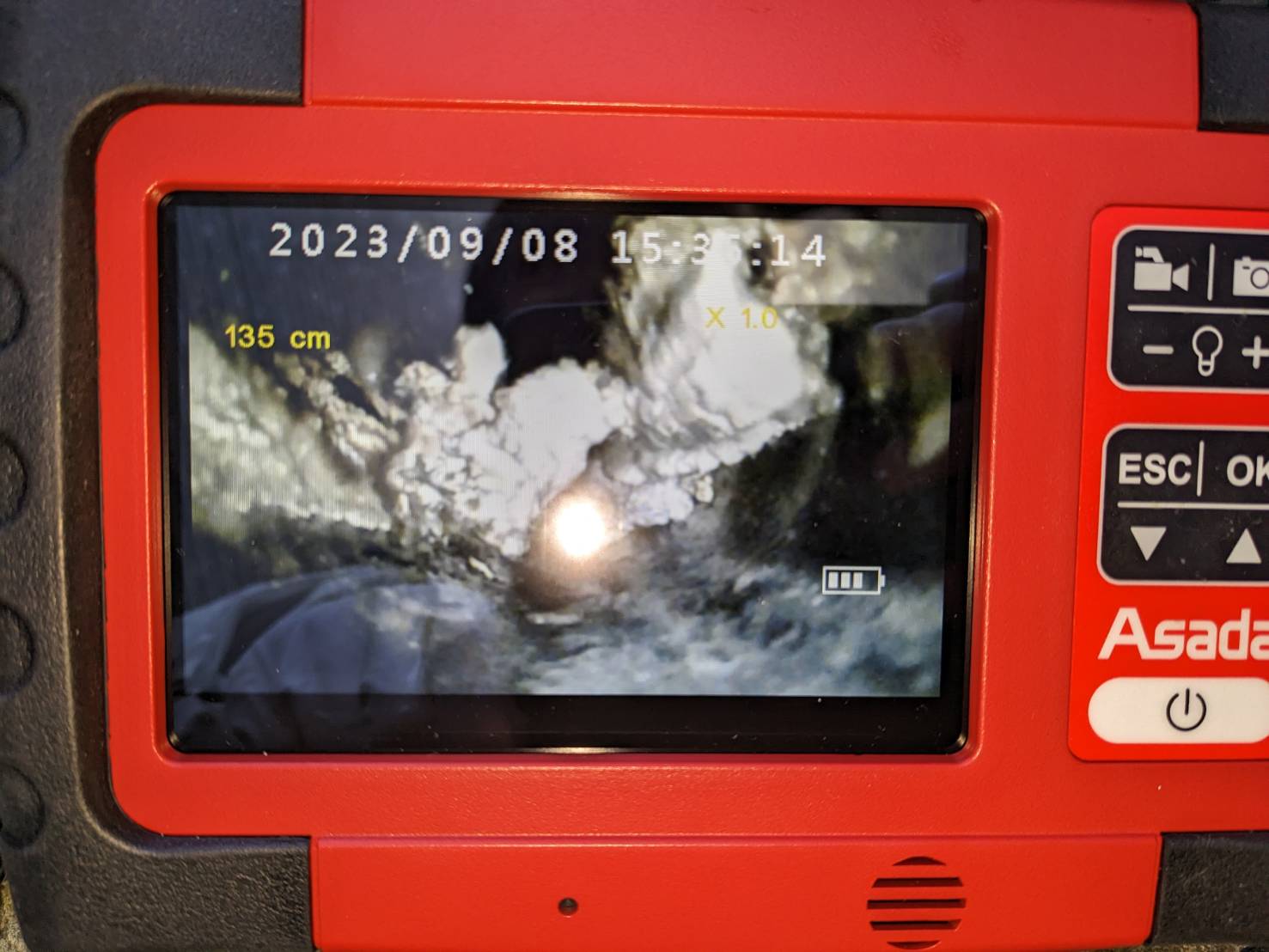 配管をカメラで見ながらの作業。石のような塊がごっそり取れますよ!流れが気になる方は完全に詰まってしまう前に、