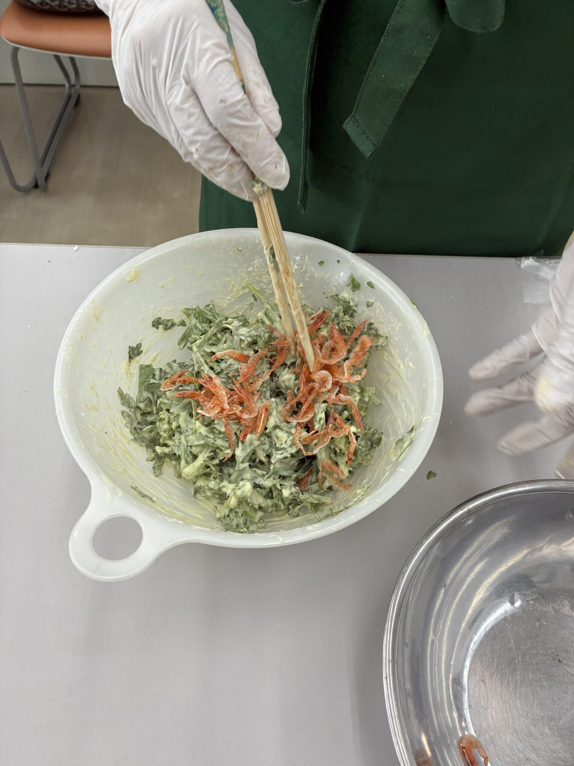 春菊と桜えびのかき揚げも大好評でした!市販の天ぷら粉と水の割合は、マヨネーズで和えた感じです。
