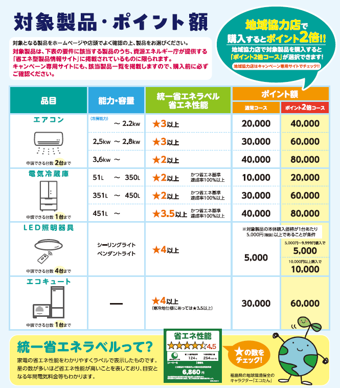 対象商品は「省エネ型製品情報サイト」に掲載の省エネ性能が高いモデルが対象で、