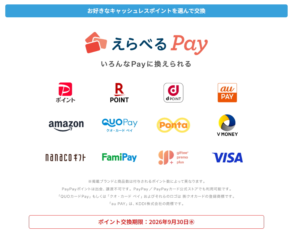 えらべるPay(スマホのキャッシュレス決済)以外にも、JCBギフトカードやクオカードも選べるようです。