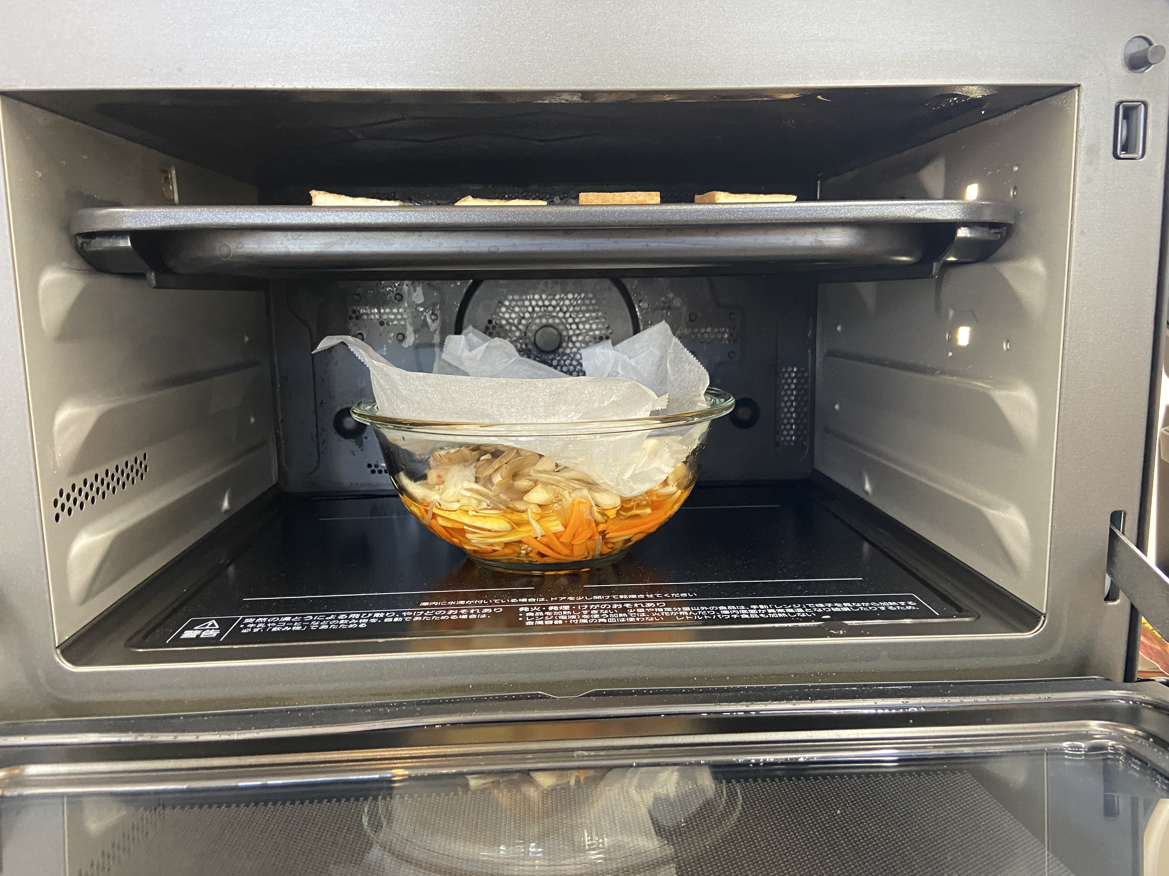 グリル皿でお肉やお魚を焼きながら、下の空いたスペースで、耐熱ボウルで煮物や汁物を作っちゃう🧑🍳