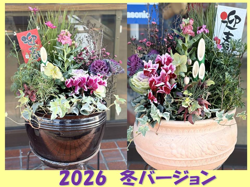 さて、お店の前の花を冬バージョンに植え替えました。
