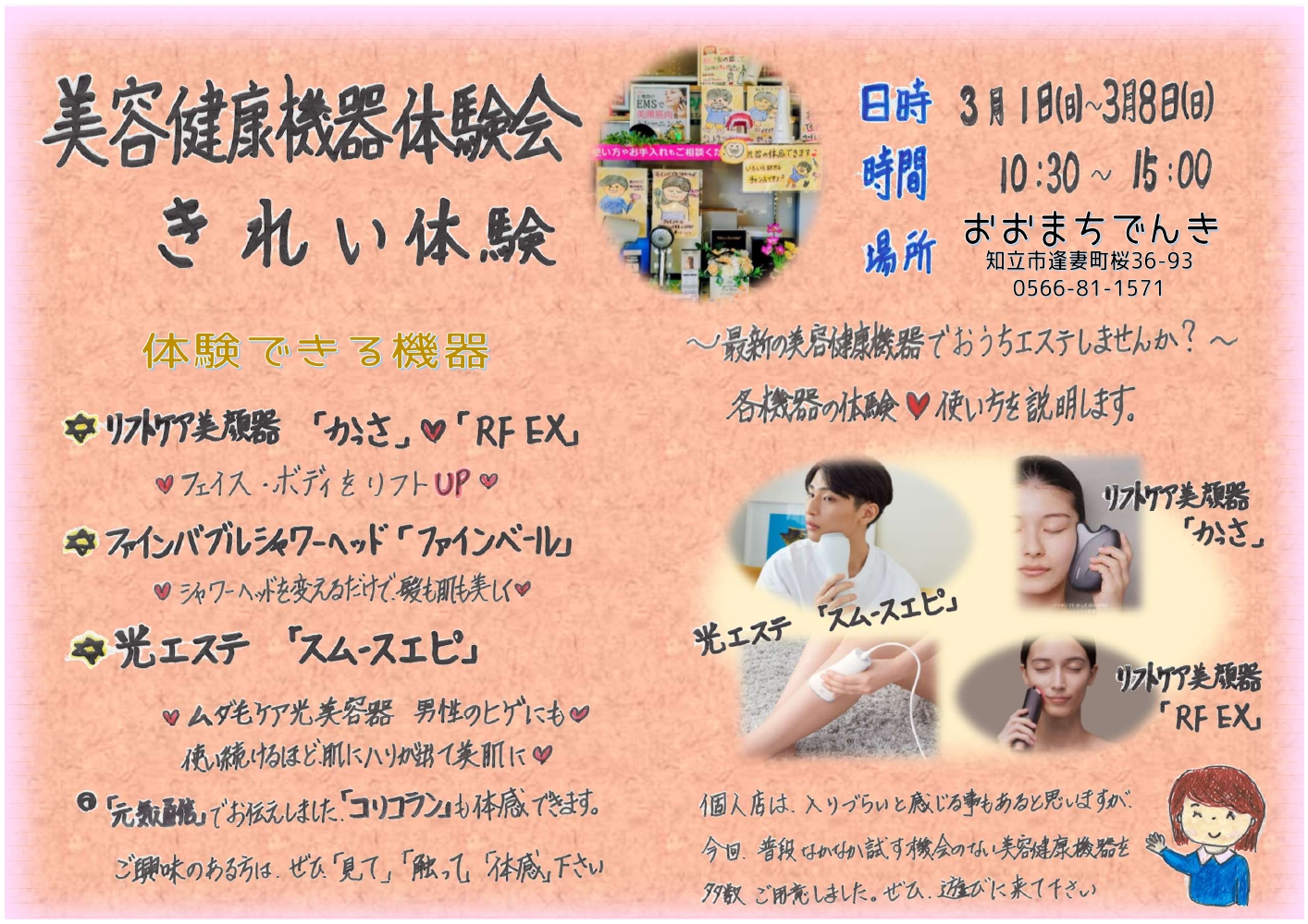 3月1日(日)から3月8日(日)までの期間、美容健康機器の体験会を行ないます。