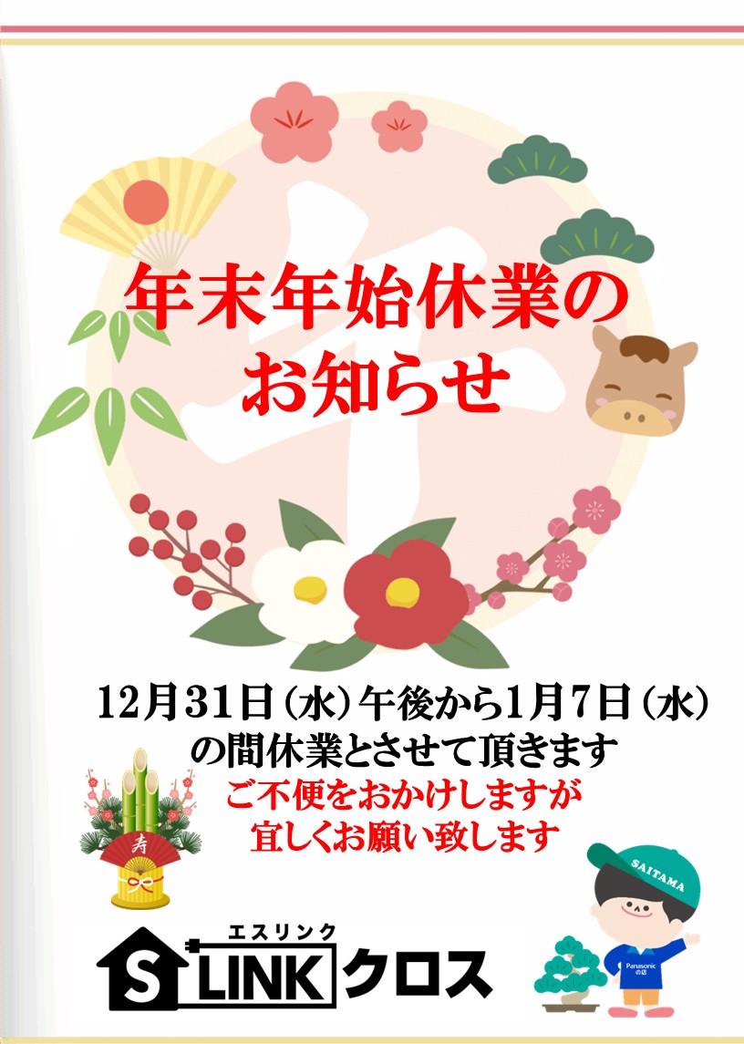 12月31日(水)午後から1月7日(水)まで休業いたします