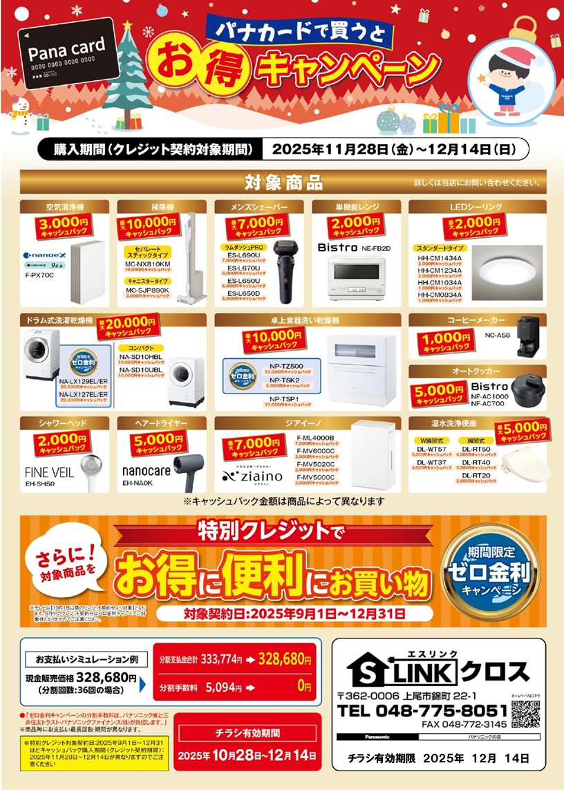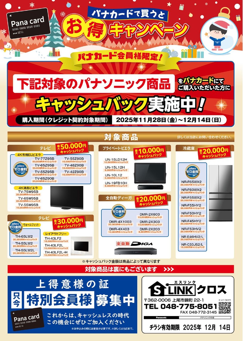 年末キャシュバックキャンペーン 2025.11.08 年末キャシュバックキャンペーンのお知らせ 各期間中にパナカード購入でキャシュバックが有ります この機会にお求め下さい 年末キャシュバックキャンペーン
