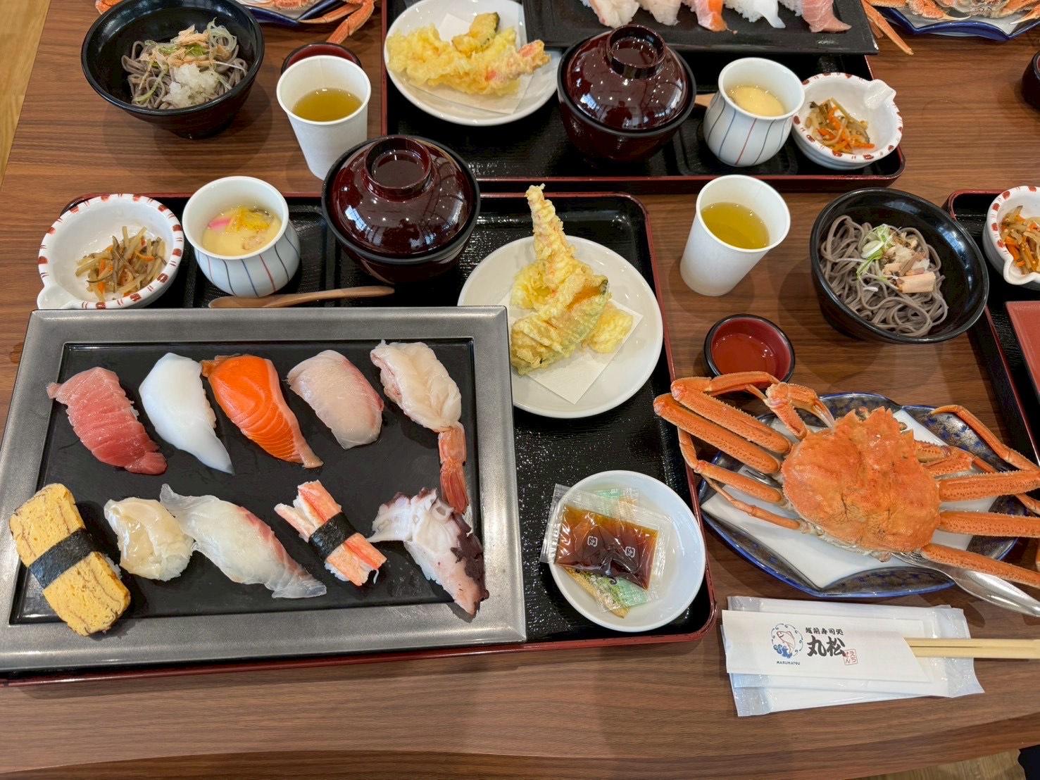 蟹まるごと一杯にお寿司やてんぷらなど、おいしそうなものが目白押し。