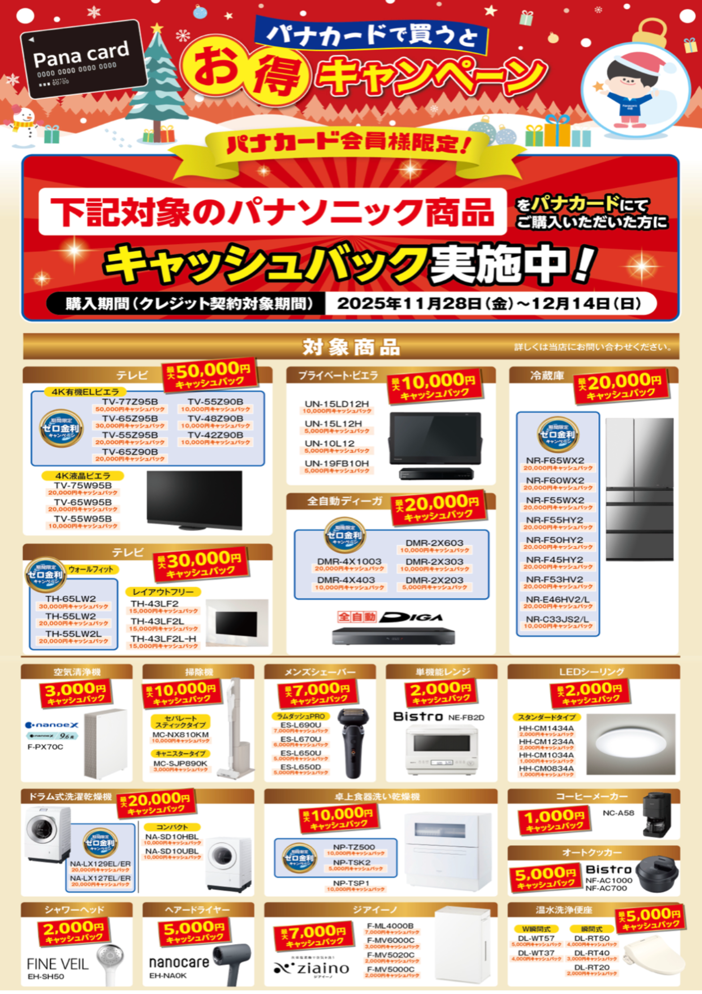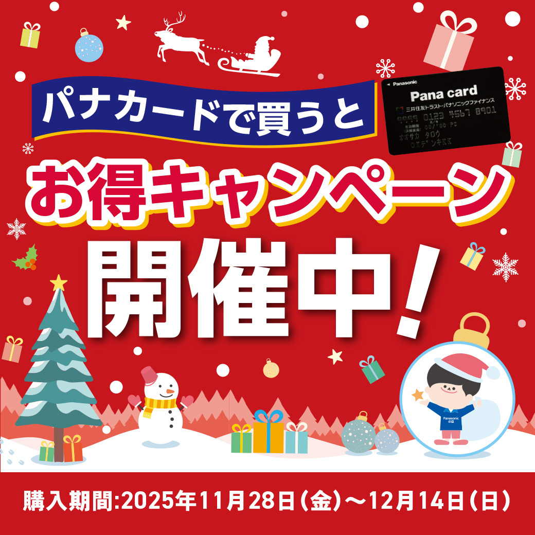 キャンペーン期間中に対象商品をパナカードでご購入いただくと、お客様にキャッシュバックいたします! この機会にぜひお買い求めくださいませ。 パナカードをお持ちでないお客様は、この機会にぜひご加入ください
