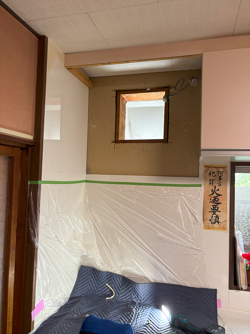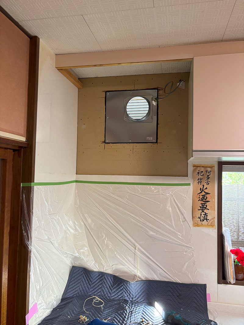 既存の壁付け形換気扇(壁面部に羽のあるタイプ)からスマートスクエア形(シロッコファンタイプ)に取り換えるときの施工の様子を写真で公開!